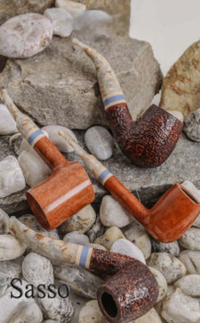 Die Sasso-Serie ist in glatter natürlicher und rustikaler brauner Ausführung erhältlich und wird in 6 verschiedenen Modellen angeboten. Die Pfeife hat einen Schaft aus Acryl mit Craquelé-Farben, die von Beige bis Grau reichen. Zwischen zwei dünneren Ringen, die die Farbe des Stiels aufgreifen, befindet sich ein pulverblaues Acrylband in einem passenden Farbton. Ein gerades Billard mit begrenzten Abmessungen. Leicht, einfach zu reinigen und zu rauchen, ein Modell für jedermann.